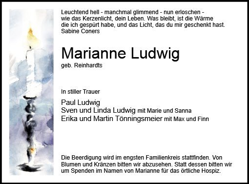 Lieber Paul, leider haben wir jetzt erst von Mariannes Tod erfahren, weil wir im Urlaub waren. Wir sind unendlich traurig und senden dir unser herzliches Beileid! Gerne denken wir an unsere gemeinsamen schönen Stunden zurück. Wir kommen bald nach Lübeck, um an Mariannes Grab Abschied zu nehmen, dann melden wir uns bei dir.